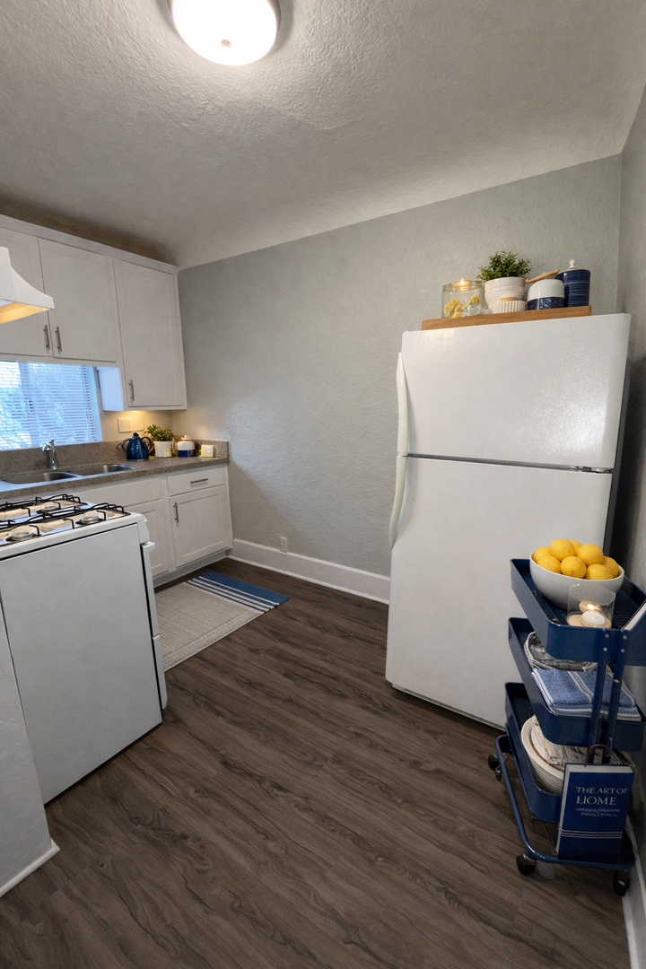 CHARMING 1 BEDROOM | 1 BATH IN THE CITY OF SAN PEDRO — Comfortable downstairs unit featuring a gas stove and fridge, quartz countertops, and gas wall heater. The home offers vinyl click flooring throughout, ceiling fan, blinds and window screens, and two-tone paint. No smoking and no pets. Street parking only.
