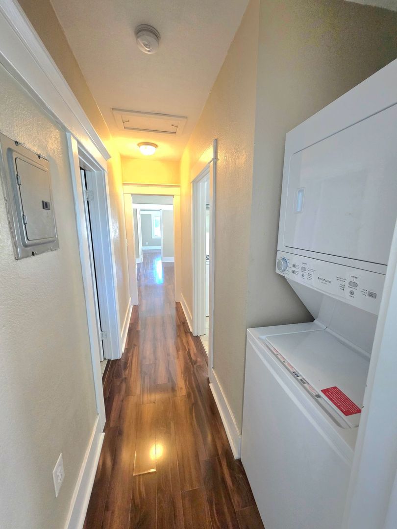 Welcome to your new home in Long Beach, CA! This stunning 2-bedroom, 1-bathroom apartment is a gem that comes with a stackable washer/dryer included for your convenience. The apartment features a gas stove for those who love to cook, and a bath vanity for added elegance. Stay warm during the cooler months with the gas wall heater, and enjoy the fresh paint throughout that gives the space a clean, modern feel. The apartment is an upstairs unit, offering a great view and plenty of natural light. The kitchen cabinets provide ample storage, and the ceramic flooring in the kitchen and bathroom adds a touch of sophistication. Relax in the tub after a long day, and enjoy the cool breeze from the ceiling fan. The laminate flooring in the living room and bedrooms adds a warm and cozy touch to this beautiful apartment. Don't miss out on this amazing opportunity to live in Long Beach, CA!