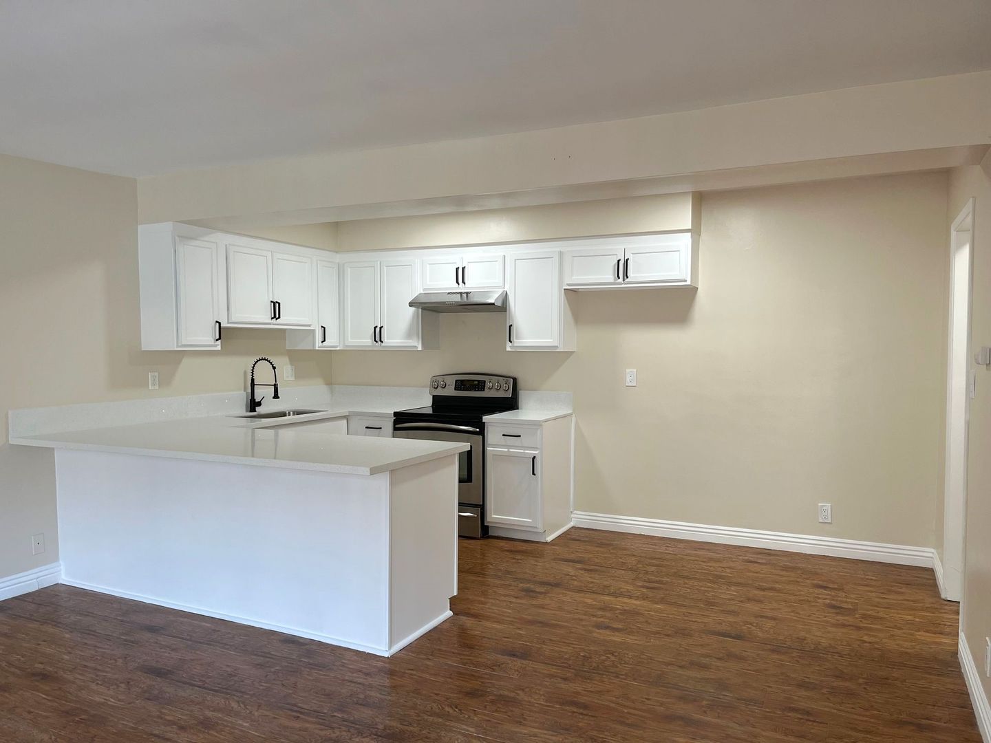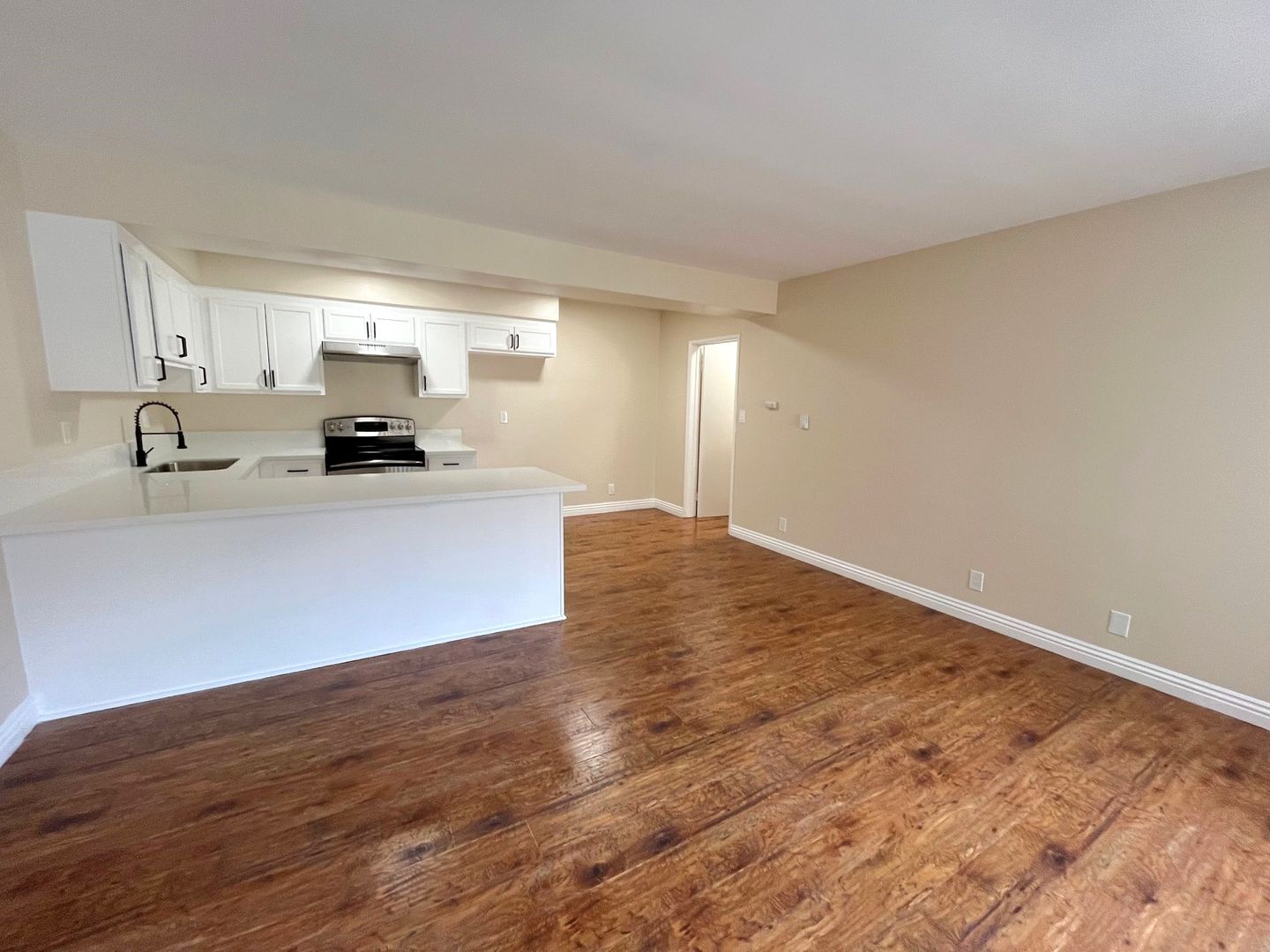Welcome to this extra-large downstairs 1 bedroom, 1 bathroom apartment located in a gated building. This beautifully updated unit features a spacious layout, large closet, and fresh two-tone paint throughout, offering a clean and modern feel. The upgraded kitchen includes new quartz countertops, new kitchen cabinets, and a gas stove—perfect for everyday cooking. Additional features include vinyl click flooring, blinds and window screens, an electric ceiling heater, and a reglazed tub. Enjoy the convenience of onsite laundry and the added perk of a community pool for relaxing and unwinding. Enjoy the convenience of onsite laundry and the added perk of a community pool for relaxing and unwinding.